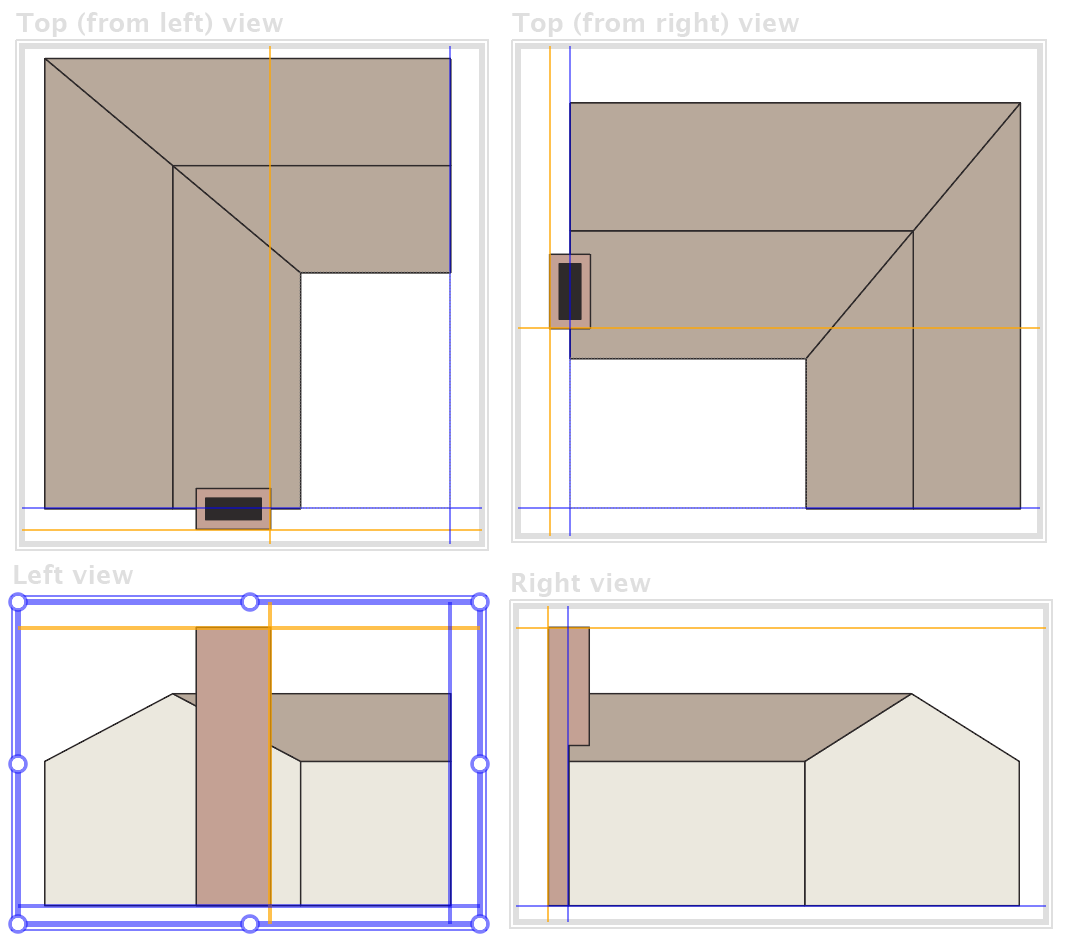Projecting the roof at their inclined planes is not possible with the current Perspective panel, but it’s easy to work around it. First, move your offset (orange) plane markers in the top view by Alt/Option-clicking on the intersection of the four roof sections.