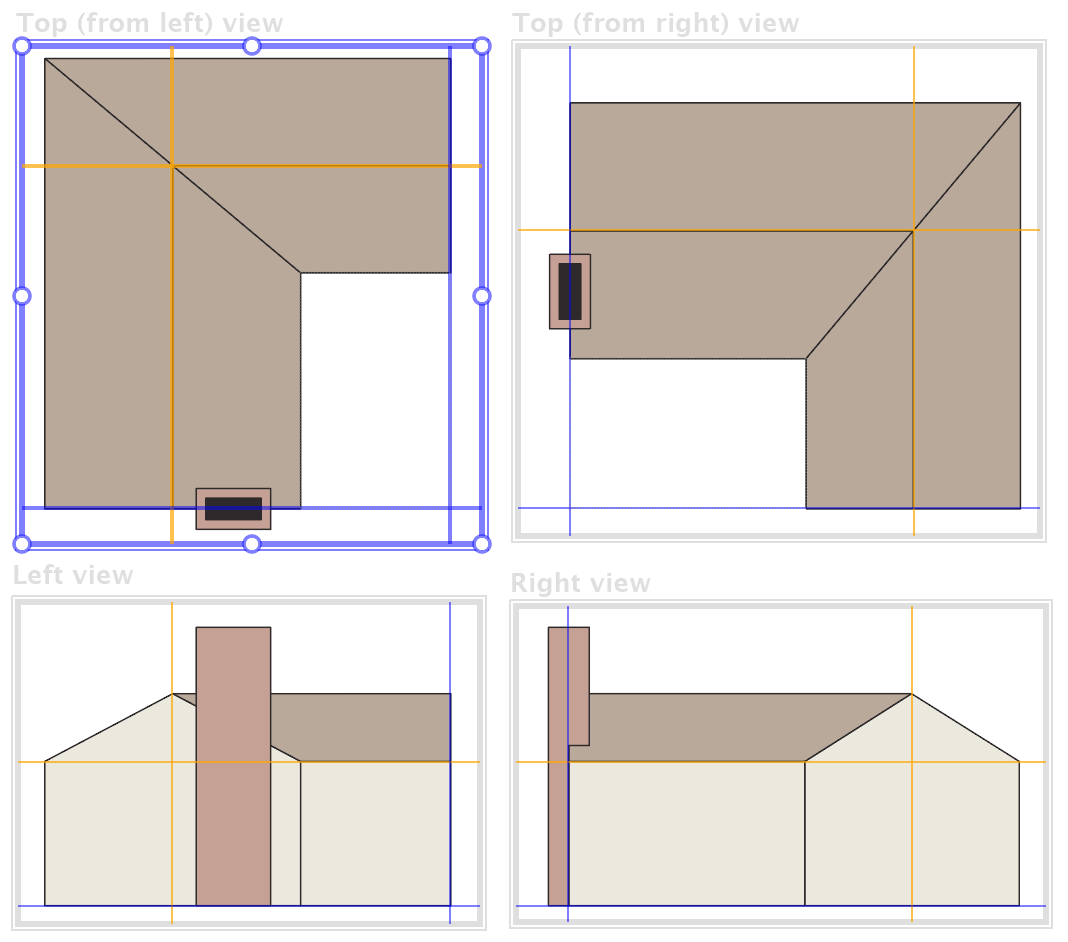 Projecting the roof at their inclined planes is not possible with the current Perspective panel, but it’s easy to work around it. First, move your offset (orange) plane markers in the top view by Alt/Option-clicking on the intersection of the four roof sections.