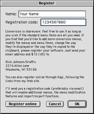 2) If you haven't yet paid your registration fee, you'll need to mail a check as explained in the Register window, or you can register online via Kagi shareware service. To register, online, you can click the "Register online" button Fill in your name and registration code which were emailed to you, then click OK That's it! You're now registered. |