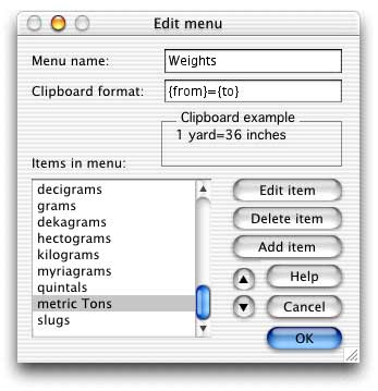 The clipboard format allows you to customize how a calculation is formatted when it's copied to the clipboard. The example shows you the result of your format. More information is provided in the documentation. If you double-click an item in the list, or click the "Edit item" or "Add item" button, you'll be presented with the next window. |