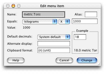 The Alias is an optional tag of up to three characters, including an inch (') or foot mark ("), which will allow you to specify units later without selecting them in the menu. You can define an item as being relative to another either by multiplication or division (e.g., a foot can be an inch x 12 or a yard / 3). A default no. of decimal places can be specified for this item, but it can also be overridden by the user. An Alternate display can be defined to show a calculation on another line and in another form. For example, 18 inches can be displayed as 1'-6". The Example box allows you to test your Alternate display formula. The clipboard format allows you to customize how your calculations are copied to the clipboard. |