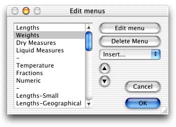 Choose "Edit Menus" from the Edit menu, and this dialog box will appear. Choose a menu from the list to edit or delete it, or to change its location in the list. From the popup/dropdown menu, you can insert or add a menu or divider. |