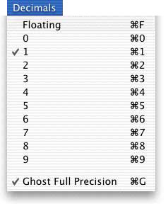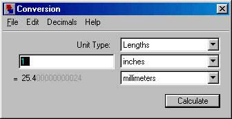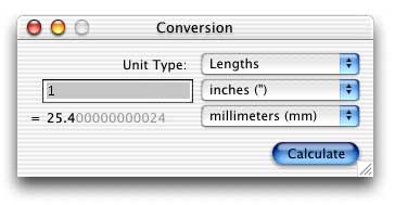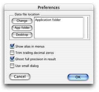 Users can choose from several preferences to customize the way they work. The location of the menu data file can be specified. "Show alias in menus" adds measurement unit aliases such as "in." or "mm" to the popup menus following the item names. "Trim trailing decimal zeros" allows users to choose whether to force fixed decimal settings by adding zeros to the end as needed. "Ghost full precision" shows digits otherwise trimmed due to decimal settings. This can be seen in the Mac OS X example above. "Use small dialog" reduces the size of the main window and its contents (Mac OS and Mac OS X only)