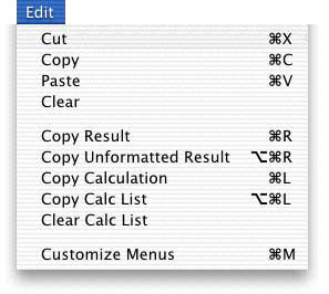 Copy Result simply puts the calculated figure on the clipboard as-is, with no formatting applied. Copy Result puts both the input figure and calculated result on the clipboard. Copy Calc List copies all calculations made since the application was launched or since the list was cleared. Clear Calc List simply clears the list of calculations. Customize Menus should be pretty self-explanatory, and is explained below. |