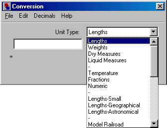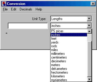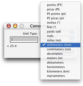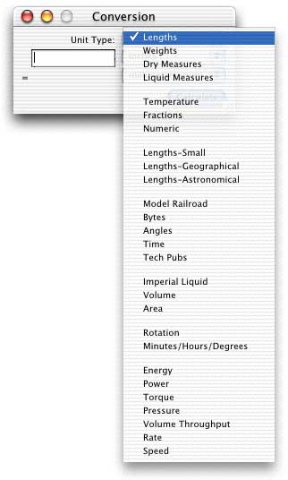 1) Choose a type of measurement to convert. If you're using Windows and are in need of an item that's not shown in the Windows drop down menu, you may need to do some clicking and searching using the menu's scroll bars. Mac popup menus are somewhat different in that all available items will be visible, as shown in the Mac OS X screen capture below. |