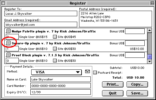 You can either run the Register program that came with your software or use your credit card when you register via the Internet. Using the Register program through Kagi, you can pay with check/money order, cash, invoice, or credit card.