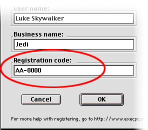 When your registration code arrives, you can enter it in the Registration Code field of the Registration dialog box as shown below.