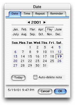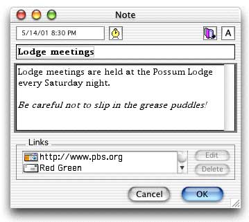 Drag a URL address into the Links list to create a link to that Web site. Double-click the item in the URL and your default browser will take you there. Drag an email address into the Links list box to create a link that will create a new mail message in your default email program. Drag a text file, folder, or another note into the list for a double-clickable shortcut to that item. Click the date button to create a date as shown below.