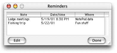 Double-click the note in the NotePod list to edit it. Drag a text file or text from another application (such as Eudora email) into the NotePod window to create a new note.